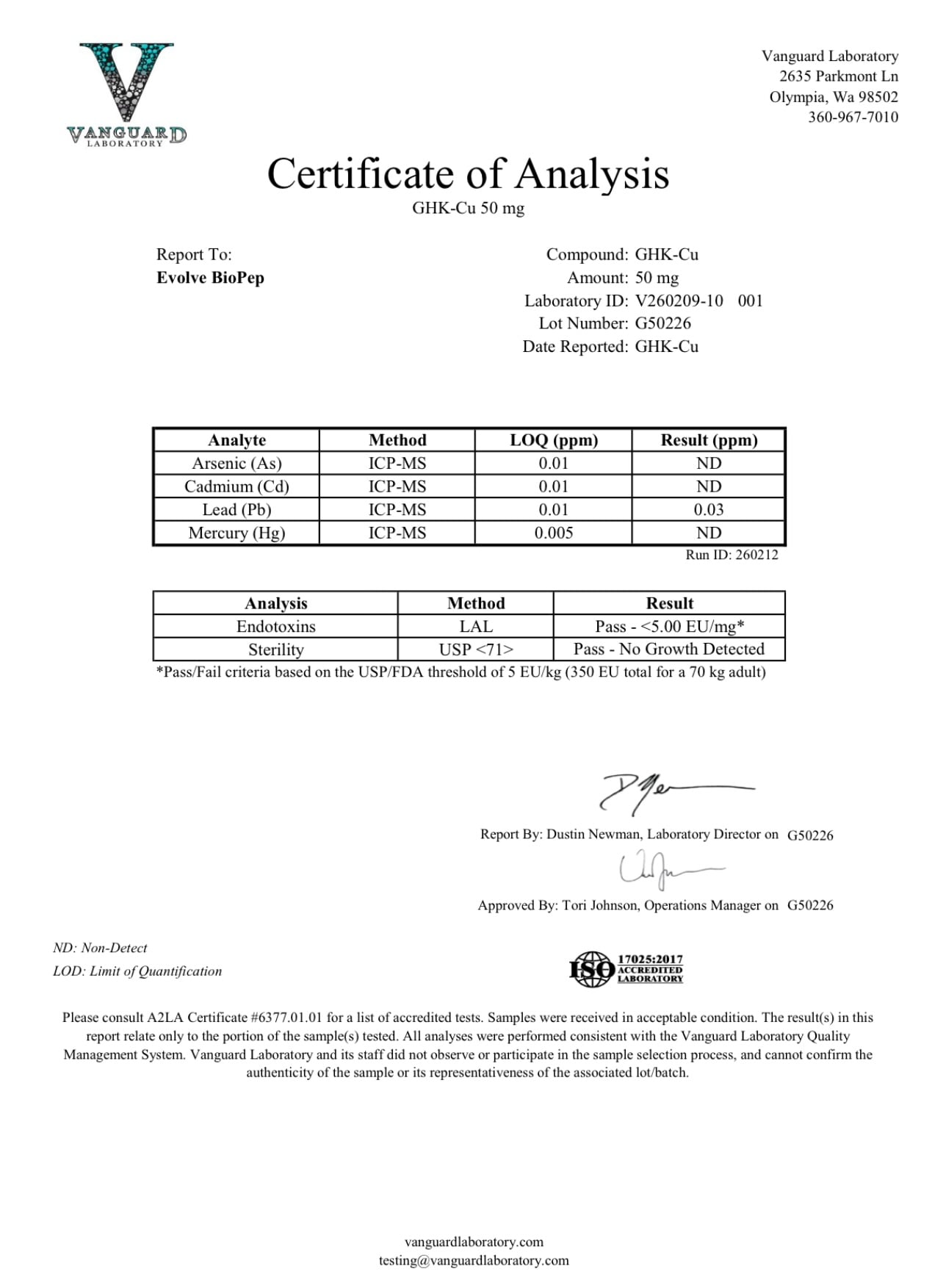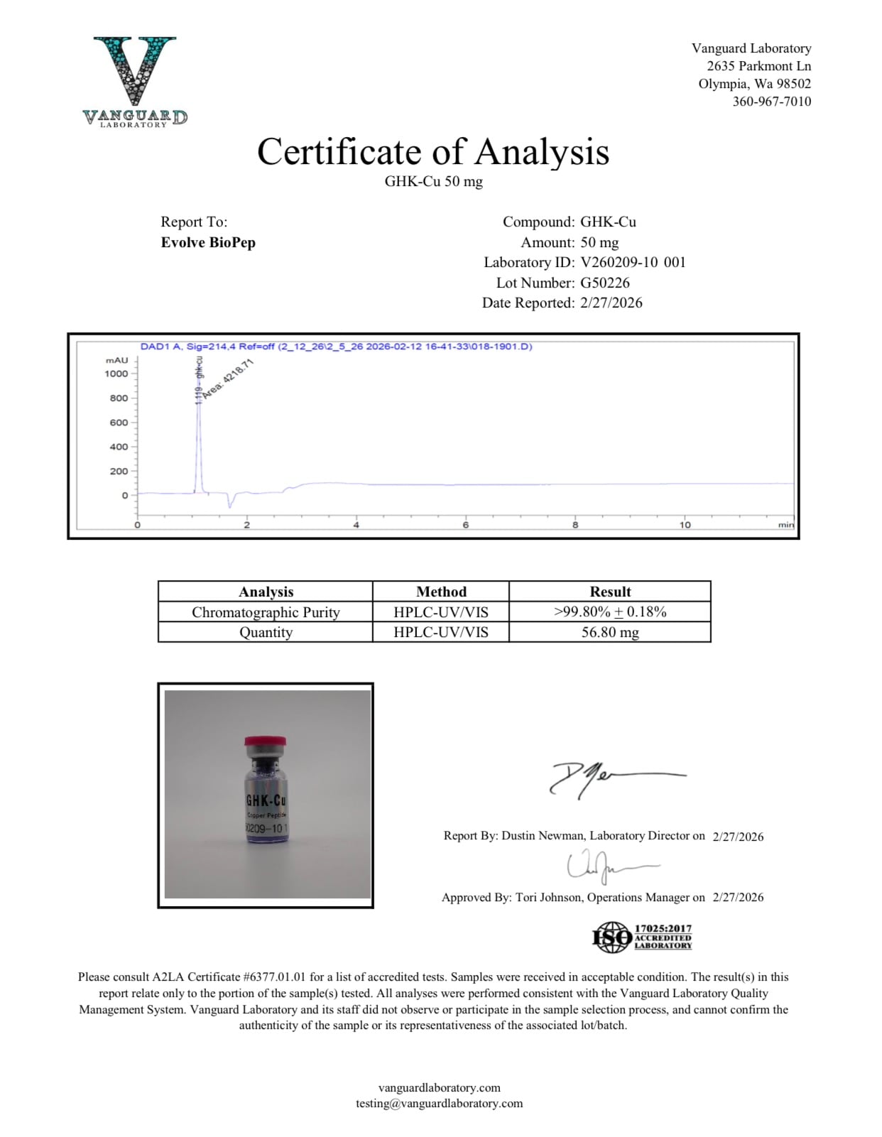GHK-Cu 50mg Lyophilized Powder COA 46.54 mg