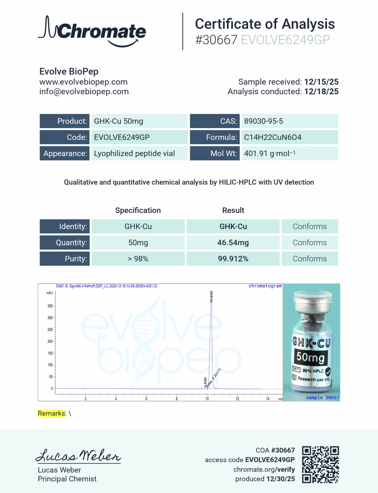 If independent confirmation is desired, identity and purity may be assessed by any properly equipped laboratory using standard analytical methods, including but not limited to HPLC, UV-Vis spectroscopy, pH analysis, or mass spectrometry.
