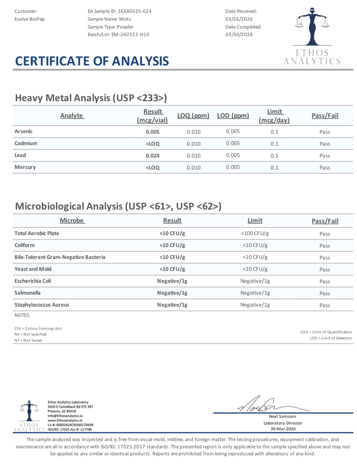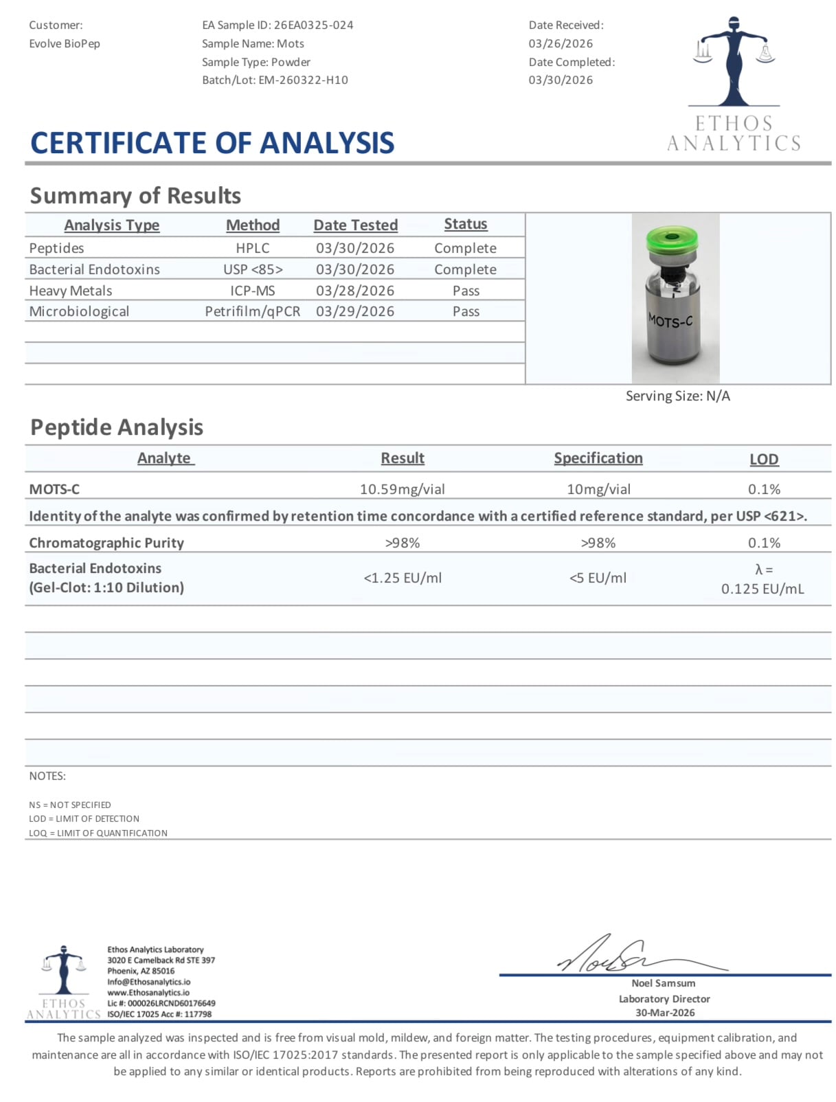 EvolvE BioPep guarantees the labeled mass and purity of all research compounds at the time they leave our facility, as verified by internal quality control and independent third-party analytical testing.