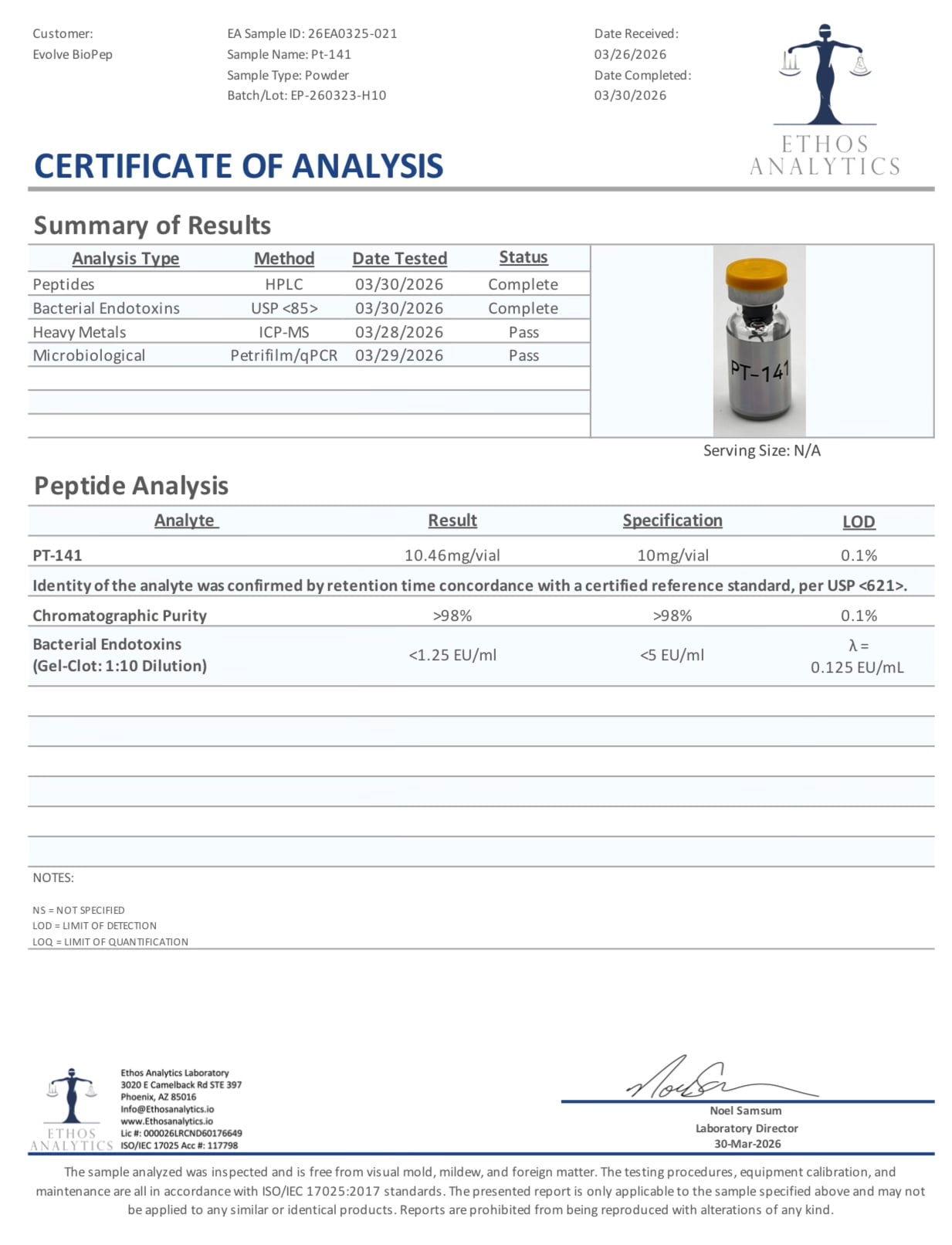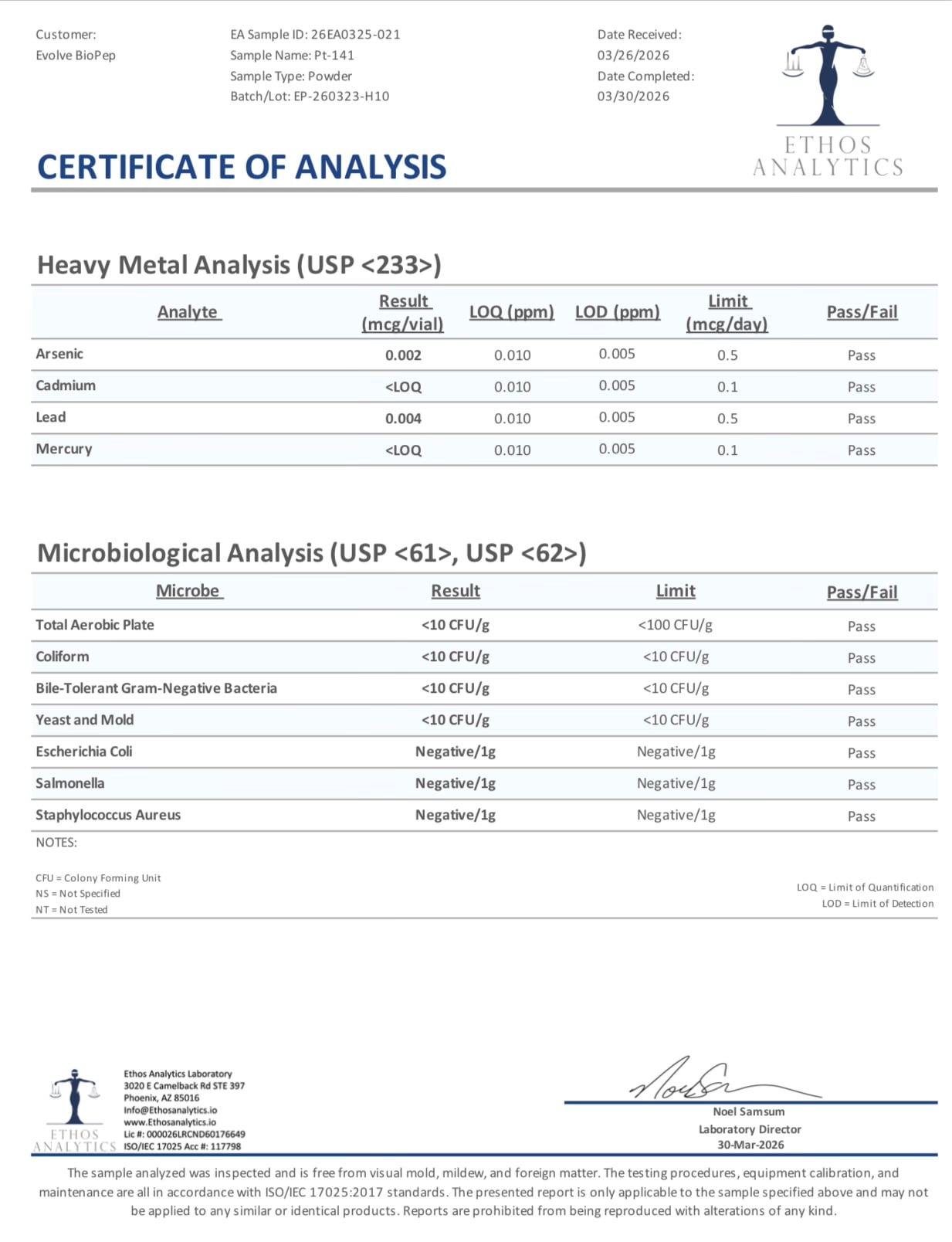 EvolvE BioPep guarantees the labeled mass and purity of all research compounds at the time they leave our facility, as verified by internal quality control and independent third-party analytical testing.
